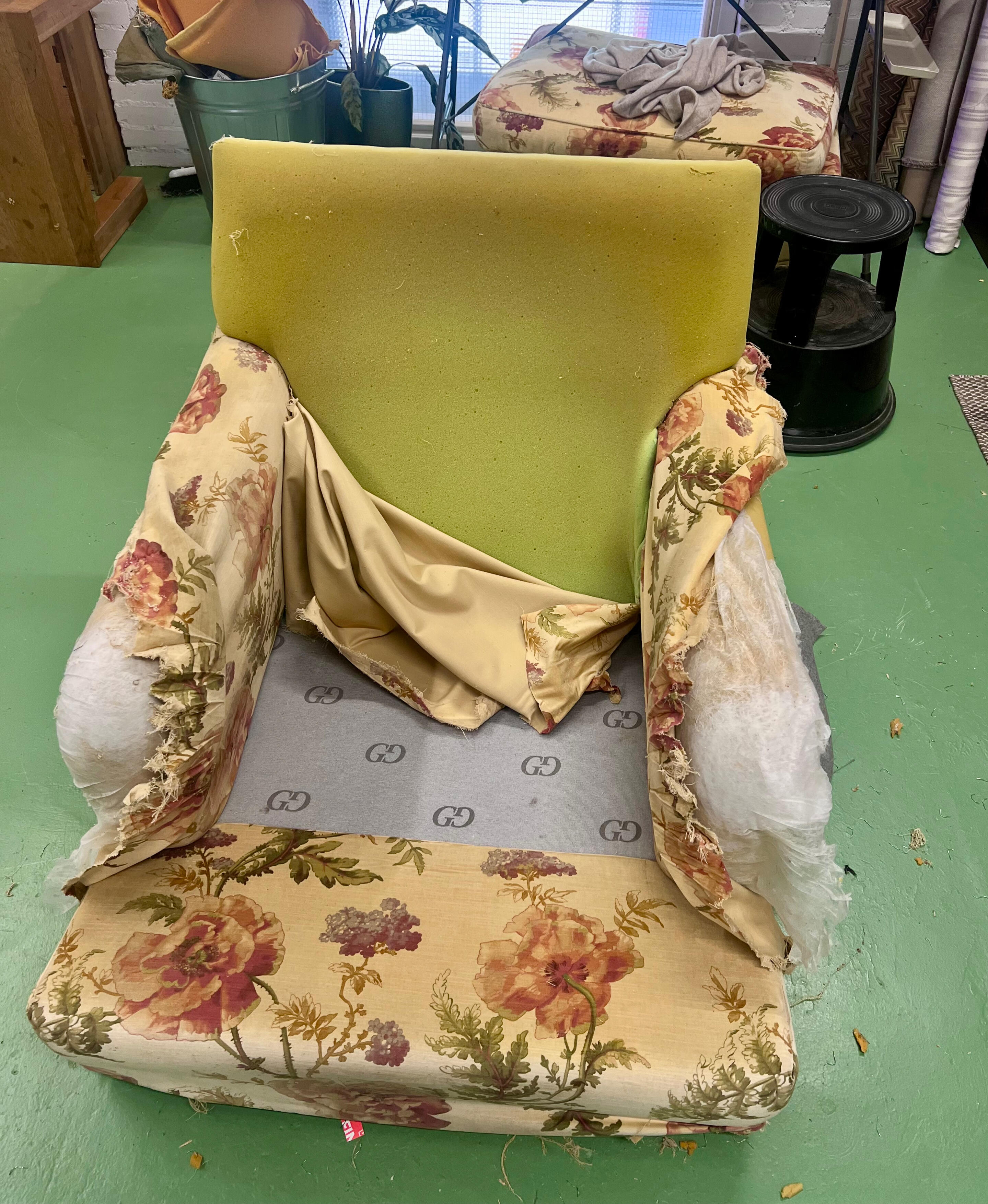 Some things I'm working on currently: reupholstering two classic English lounge chairs, upholstered cushions for a kitchen bench seat, and making a new lampshade for an heirloom lamp.